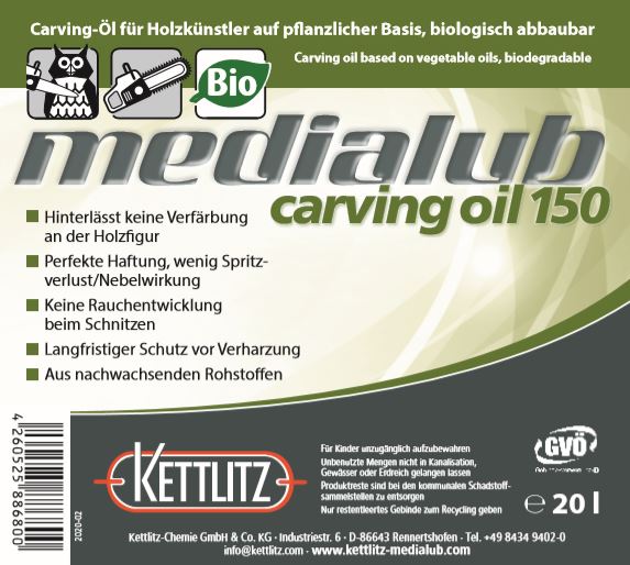 KETTLITZ-Medialub carving oil 150 ist ein auf biologischen, nachwachsenden Rohstoffen basierender Haftschmierstoff für Motorsägen, welcher für präzise Holzbearbeitung entwickelt worden ist. Die Eigenschaften des Produktes sind vornehmlich für den Anwendungsbereich der Holzschnitzkunst ausgelegt.