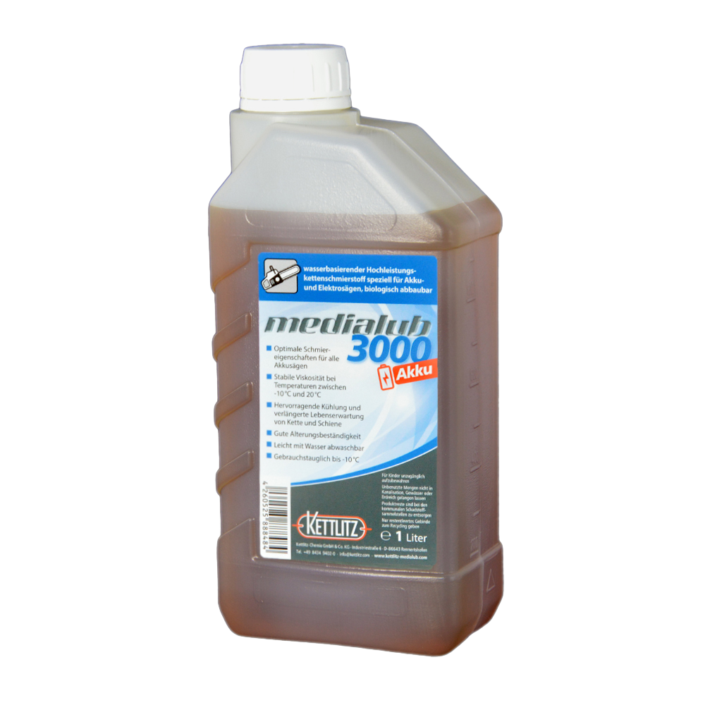 KETTLITZ-Medialub 3000 AKKU ist ein neuer, wasserbasierender Hochleistungskettenschmierstoff für Motorsägen. Durch den Einsatz spezieller Additive besitzt Medialub 3000 AKKU ausgezeichnete Schmiereigenschaften und ein einzigartiges Viskositätsverhalten. Anders als bei herkömmlichen Schmierstoffen erhöht sich die Viskosität von Medialub 3000 AKKU bis zu einer Temperatur von ca. 38 °C. Bei Temperaturen unter 15 °C wird Medialub 3000 AKKU hingegen dünnflüssiger. Das verhindert zum einen den vorzeitigen Schmiermittelverlust an der Kette, speziell bei hohen Umdrehungsgeschwindigkeiten und Temperaturen, zum anderen wird die Handhabung des Schmierstoffes bei niedrigeren Außentemperaturen erleichtert. Selbst bei 50 °C zeigt Medialub 3000 noch eine Viskosität von ca. 60 mm²/s.