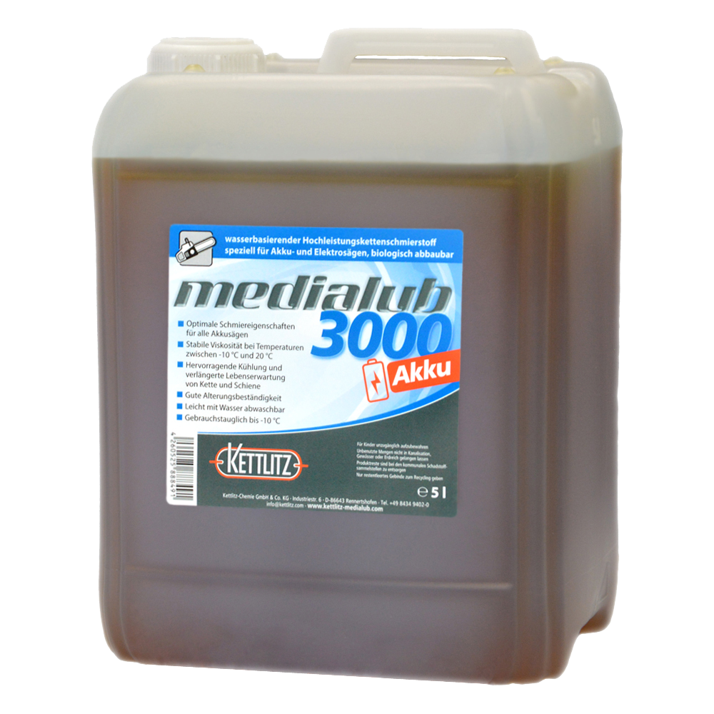 KETTLITZ-Medialub 3000 AKKU ist ein neuer, wasserbasierender Hochleistungskettenschmierstoff für Motorsägen. Durch den Einsatz spezieller Additive besitzt Medialub 3000 AKKU ausgezeichnete Schmiereigenschaften und ein einzigartiges Viskositätsverhalten. Anders als bei herkömmlichen Schmierstoffen erhöht sich die Viskosität von Medialub 3000 AKKU bis zu einer Temperatur von ca. 38 °C. Bei Temperaturen unter 15 °C wird Medialub 3000 AKKU hingegen dünnflüssiger. Das verhindert zum einen den vorzeitigen Schmiermittelverlust an der Kette, speziell bei hohen Umdrehungsgeschwindigkeiten und Temperaturen, zum anderen wird die Handhabung des Schmierstoffes bei niedrigeren Außentemperaturen erleichtert. Selbst bei 50 °C zeigt Medialub 3000 noch eine Viskosität von ca. 60 mm²/s.