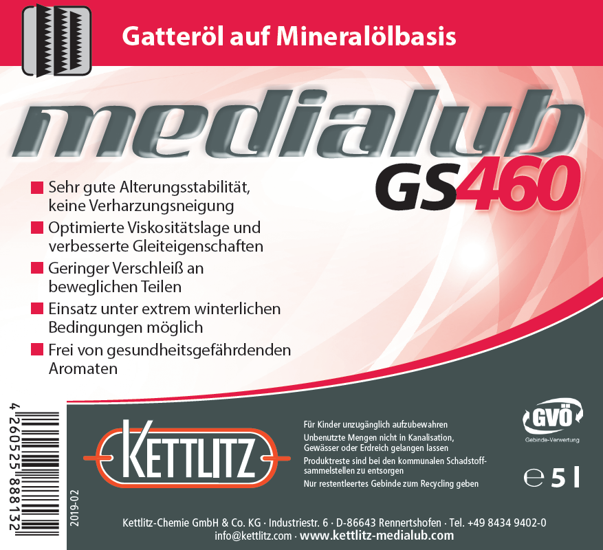 KETTLITZ-Medialub GS 460  Sägegatteröl - Spezialschmierstoff auf Mineralölbasis  - 5 Liter Gebinde